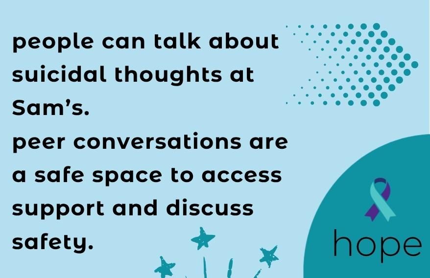 three Infographics stating: Mental health peer support is available for people noticing a difference with wellbeing, experiencing challenges, emotions, suicidal thoughts, a plan for suicide...     You are welcome to attend with a friend, family member or supporter.     Sam's is one-to-one mental health peer support...not a group support.      You are welcome to phone or visit for more information or attend the space.     There is no need for an appointment however if helpful for yourself, you can phone before attending.     The Sam's team will support you to explore what is important for you, offering peer support and resources for wellbeing.     The team at Sam's Fife are employed peer workers with SAMH (Scottish Action for Mental Health) a Scottish wide charity offering mental health support within the communities of Scotland.