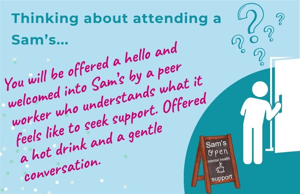 three Infographics stating: Mental health peer support is available for people noticing a difference with wellbeing, experiencing challenges, emotions, suicidal thoughts, a plan for suicide...     You are welcome to attend with a friend, family member or supporter.     Sam's is one-to-one mental health peer support...not a group support.      You are welcome to phone or visit for more information or attend the space.     There is no need for an appointment however if helpful for yourself, you can phone before attending.     The Sam's team will support you to explore what is important for you, offering peer support and resources for wellbeing.     The team at Sam's Fife are employed peer workers with SAMH (Scottish Action for Mental Health) a Scottish wide charity offering mental health support within the communities of Scotland.